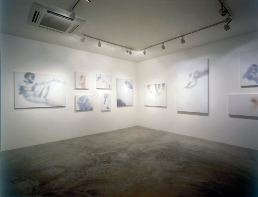 濡らした綿布に、アクリル絵の具で描かれた輪郭のないイメージ—人体の一瞬の動きや表情が、絵の具のぼけ、にじみによって浮き上がってくる、独特の魅力を放つ作品を複数点展示。