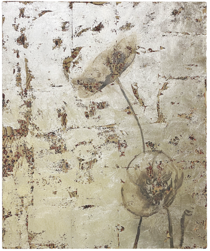 Continued with the last solo exhibition, Kurumi Kotani in this exhibition will announce her new series composed of the works created by the silver leaves attached on the cloth and sulfurized by liquid smoke solution, and other new works with different techniques. .