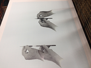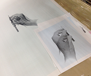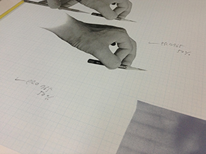 シミュレーションのため、ポジをスキャンして方眼のデータ上でレイアウトを複数つくってチェックしたが、これは当時は方眼紙の上でポジを動かしながら決めたに違いない。しかし、違う場所で他人が操作することはできない。広げて考えると、木村さんの手の映像を木村さん自ら動かしていたものが、木村さんの手を離れて、手の映像がコピーされペーストされ、リフレクトされ、レイアウトされているということになる。