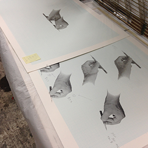ストローク版を何回かやりなおしてこれまでの雰囲気で刷ってみたが、いちばんガサッとした調子のものが面白いとのこと。意外。