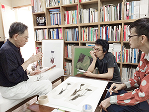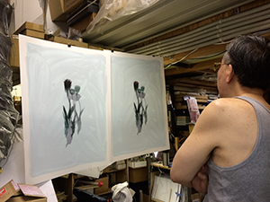 そのイメージの扱い方と原稿一枚ずつから刷版ができあがって刷り重ねられるという版画の工程に親和性を感じる。しかも版画のなかで唯一シルクだけは転写(図像が反転される)ではなく直接正像が扱える。だからシルクで仕事をしたんじゃないかと思う。