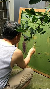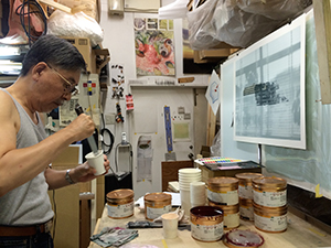 木村さんはバチベラでインクを練る。何段階かに分けて調整していってすごく少量だった試しインクを最後にはまとまった量に調色してくれた。さすが。