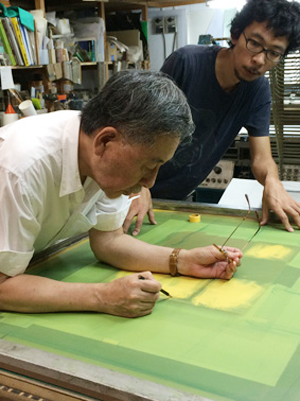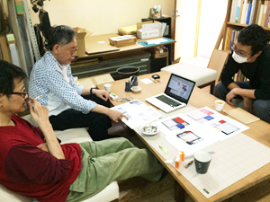 ベースになる筆致や色面の上からのせる版はいるかな、、ということで追加のポジを描いてもらう間、少し待ち。