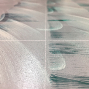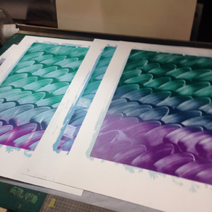 タブローもグラデーションの下地の上に半透明のメディウムでスキージングしているそう。