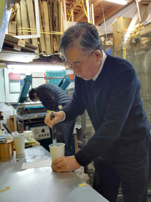 背景になるベースの色味がイマイチなので、木村さんが調色。