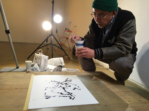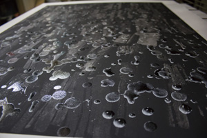 いつもなら、描画用のフィルムに絵の具で水滴を垂らす(描く)が、それではただの水滴の輪郭を持った色面になるだけなので、実際に垂らした水滴に光を当てて撮影したリアルな状態を版表現してみたいとのこと。
