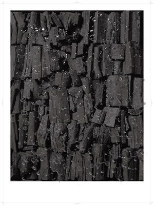 このシリーズは木炭を撮影した写真イメージを、炭の粉を混ぜたインクでプリントし、その紙を立体に組み上げ一部を焼いて焦がし、また炭に戻す、、、という3重に状況が混じり合うコンセプト。