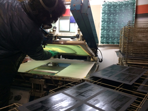 水滴の水の部分の濡れた感じに今回使ったのはアルキッド系のインク。いつも使っていないが、これまでは光沢と厚みが必要な時はエポキシ樹脂のインクを使うことが多かったが、次に上に刷るまでに硬化時間を待つ必要があり、時間短縮のため比較的セットの早い酸化重合のインクにした。低メッシュでもレベリングがよく、ハンドリングも良いので助かる。
