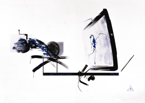 木村の自作への新たな測定行為は今回で3つ目の局面を迎えた。「Pencil」、「Water bird」とくれば、次は「A Lion in Winter」かと思いきや、タイトルは「Fragments」。シリーズ名ではなく、思考概念が持ち込まれた。思えば今回対象の1984年~88年の時期には「A Lion in Winter」に代表されるような描写対象を指示せず、生み出されたイメージと曖昧な関係を持つ語句を用いた作品タイトルの割合が増したように感じる。木村は、「断片とは、日常的な(通常の)関係から、ランダムに切り離された、事物あるいはイメージ」と定義する。その際、関係からの切断を、切断自体が意味を成すシュルレアリスムのデペイズマンでもなく、断片の積層自体を方法化するアッサンブラージュでもない「断片」自体の強度に導く構造化を課題としたと言う。この時、刷られたイメージとタイトルの語句の関係、さらには「ライオン」と「冬」や、「梯子」と「男」などタイトル内の断片としての語相互の関係は、偶然の出会いでも隠喩の多層化でもなく、必然的な無関係として、断片の強靭化に寄与しているようにも思える。