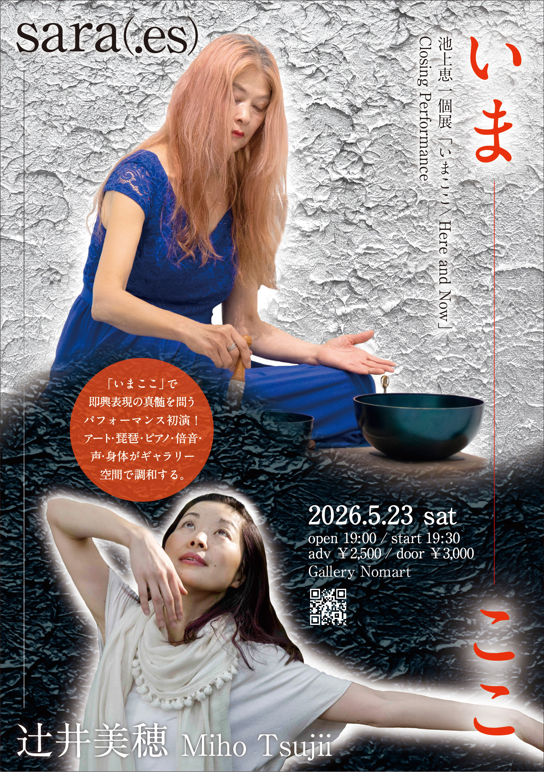 前回の池上展ではSolo演奏を行ったsara(.es)、そのLive音源「Prayer」は実験的音楽/音響プロジェクト「Utsunomia MIX」シリーズ最新作として昨年12月にリリースしたばかり。今回の池上展ではパフォーマンス・アーティスト辻󠄀井美穂を迎えたDuoパフォーマンスを行います。