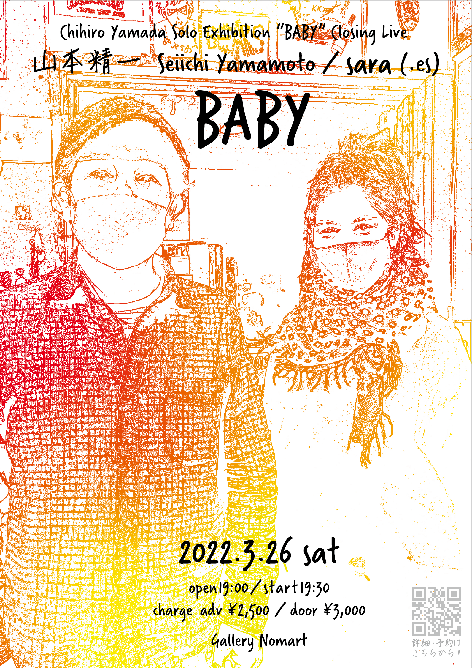 2月26日よりギャラリーノマルで一ヶ月間開催の山田千尋個展「Chihiro Yamada / BABY」。『絵の具と絵の具の重なりから、絵が生まれてくるような様子を見てもらうことができたらいいなと思い、展覧会名を「ベイビー」と付けることにした』という山田が描いた、2つのモチーフ展開によるタブローとドローイングに囲まれて、個展最終日、二人の音楽家が即興のセッションを行います。