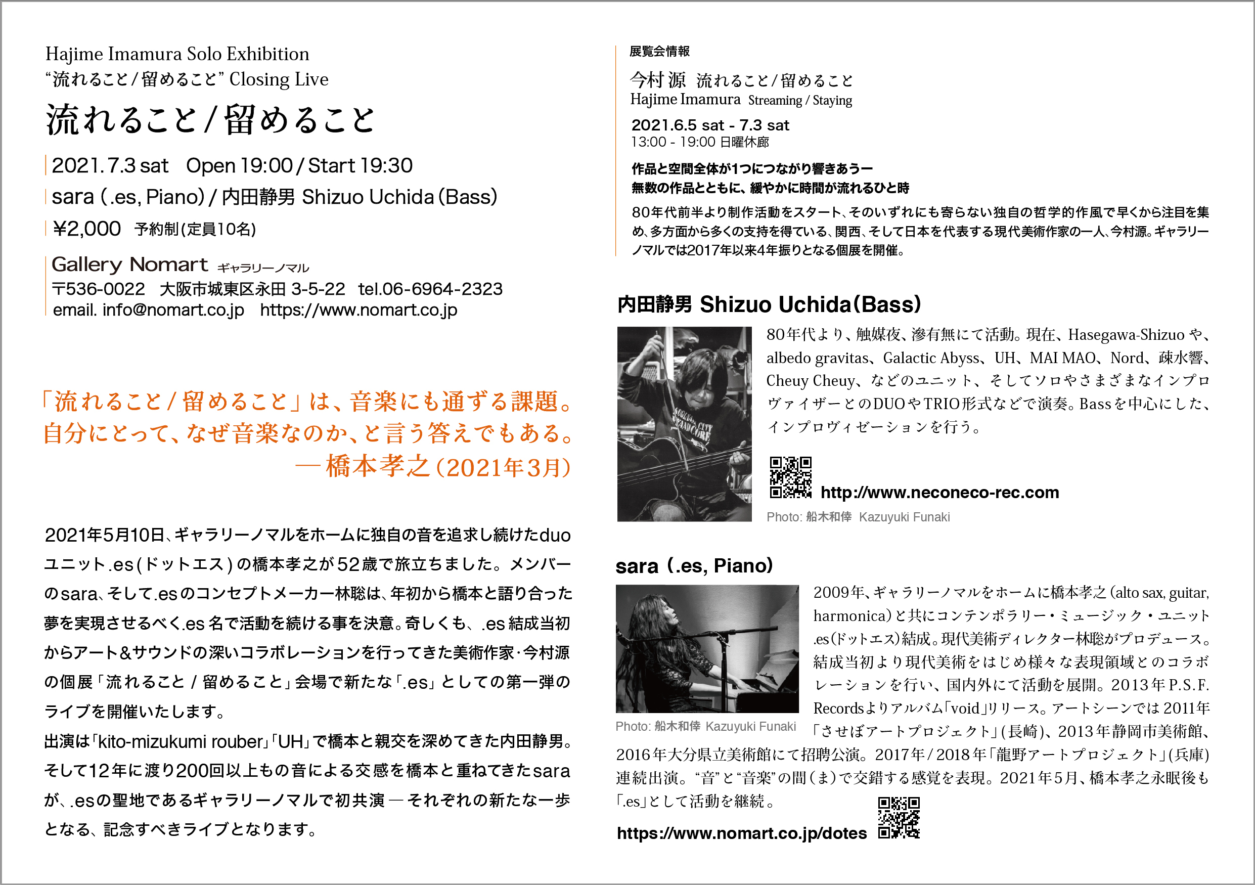 出演は「kito-mizukumi rouber」「UH」で橋本と親交を深めてきた内田静男。そして12年に渡り200回以上もの音による交感を橋本と重ねてきたsaraが、.esの聖地であるギャラリーノマルで初共演—それぞれの新たな一歩となる、記念すべきライブとなります。