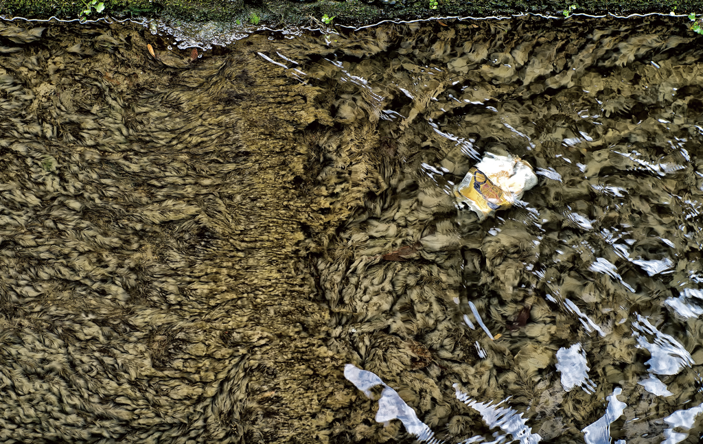 生活雑廃水が流れる下水路の底に形成される有機物の形態を撮影した作品。水の温度(熱のエーテル)と水流 (水のエーテル)が有機物に作用して形づくる非平衡なフローフォームが、新しい形態を自発的に産みだしている。